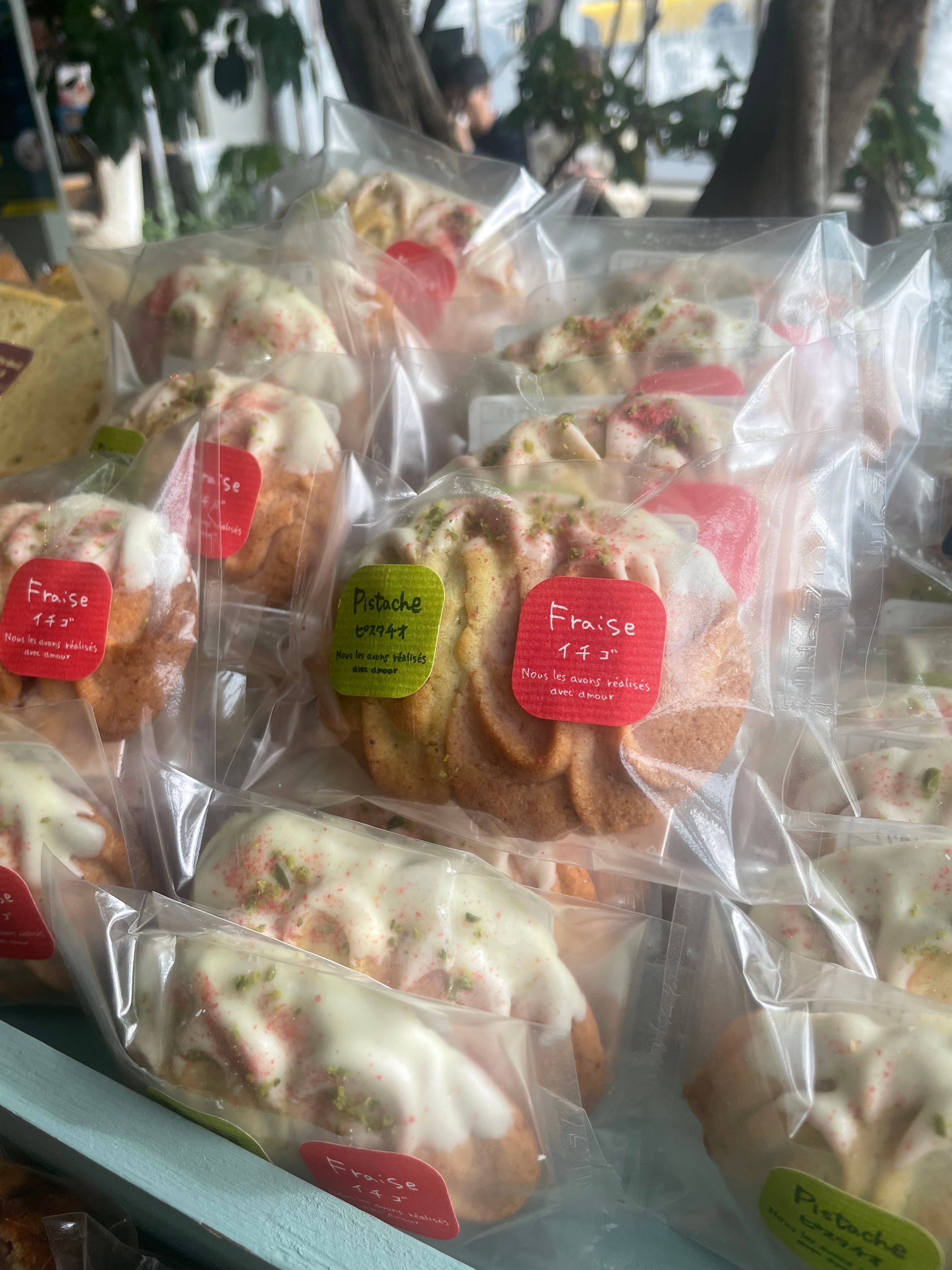 小麦粉・バター・砂糖・卵・苺ソース・ピスタチオプードル・苺濃縮液・ホワイトチョコ・ピスタチオ・バニラペースト・塩